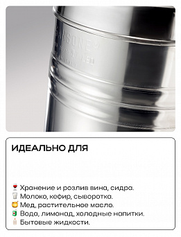 Можно использовать для хранения молока, вина, браги, спирта, концентратов, меда и других пищевых жидкостей и сыпучих продуктов, а также для брожения вин и настоек в домашних условиях.