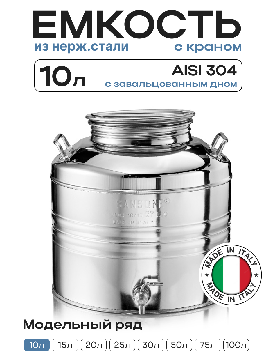Пищевая бочка из нержавейки, 10 л, с крышкой, краном, завальцованным дном