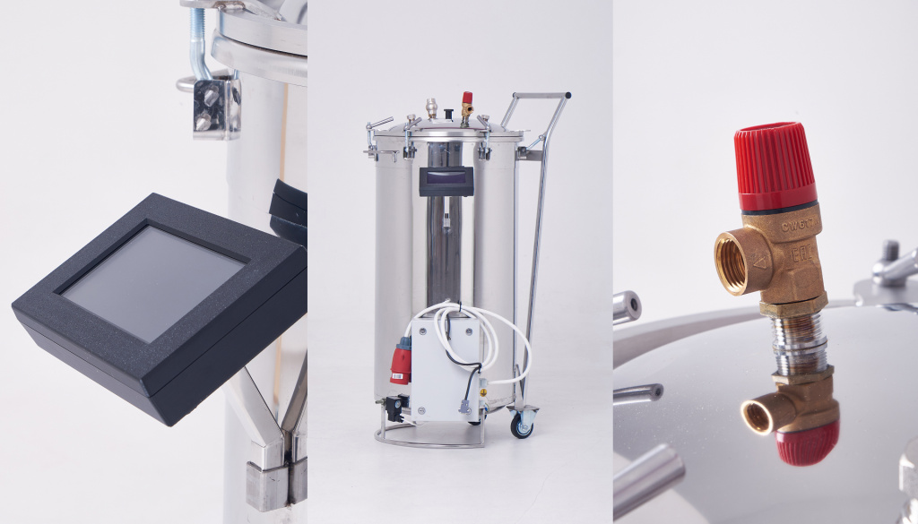 Электрический автоклав из нержавеющей стали с полностью автоматизированным процессом стерилизации. Оснащен электрическим блоком управления (ЭБУ) с возможностью стерилизации в 4 автоматических режимах "Мясо", "Птица", "Рыба", "Компот". В автоклаве предусмотрены автоматические режимы для жестяных банок и реторт-пакетов. Есть возможность сохранения до 10 собственных программ стерилизации для каждого вида упаковки.