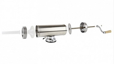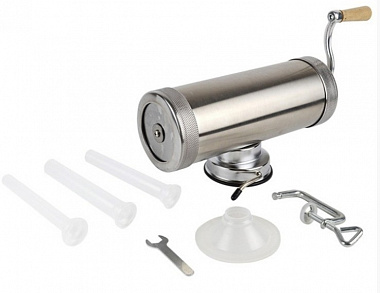 Колбасный шприц  - ручной инструмент для набивки колбас в домашних условиях, а также для небольших мясоперерабатывающих предприятий, предприятий общественного питания. Изготовлен из прочного пищевого алюминиевого сплава. В комплект входят 3 пластиковые насадки длиной 15 см и разных диаметров - 15, 19 и 22 мм, подходящие под основные виды натуральной колбасной оболочки.