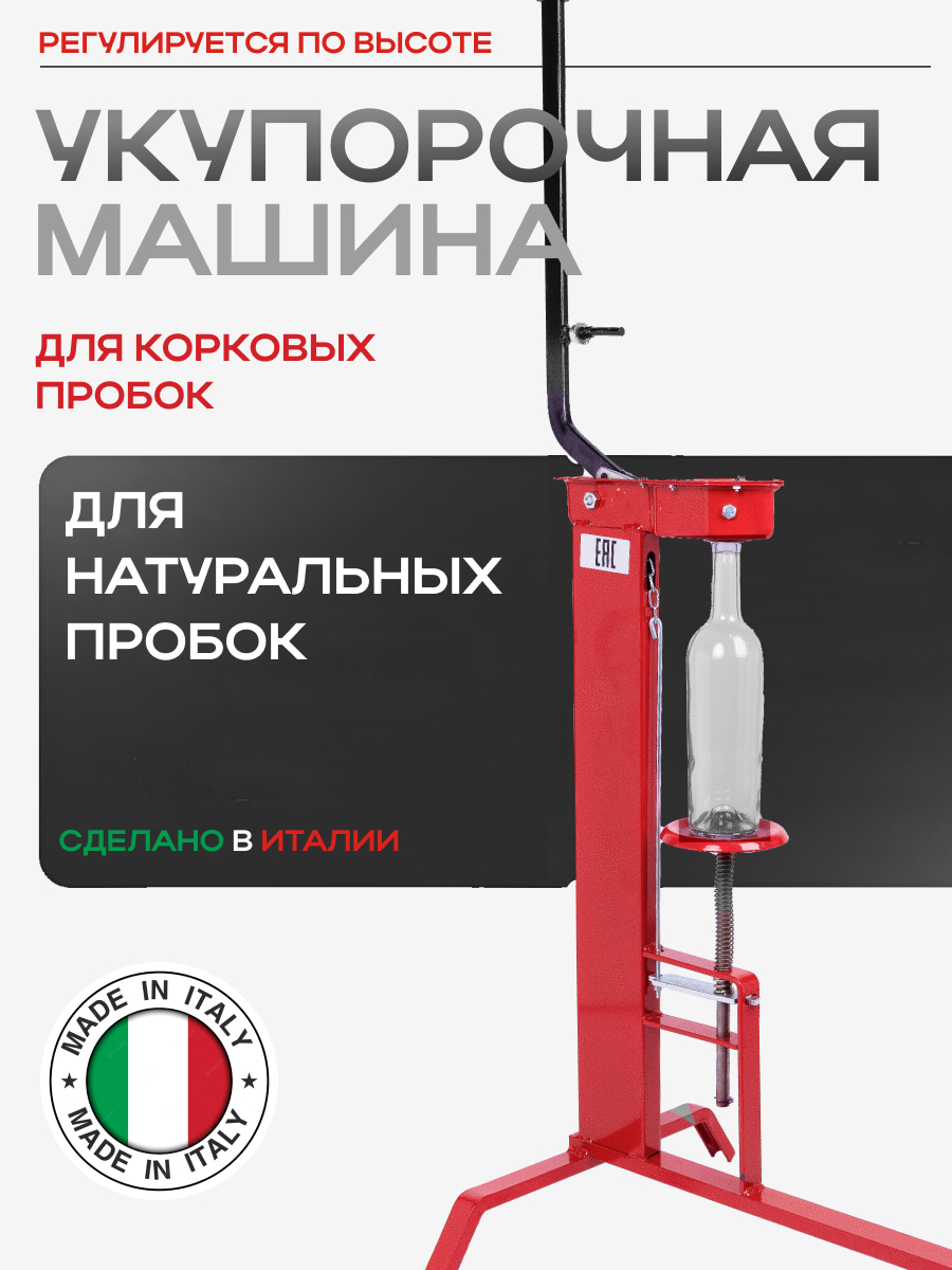 Аппарат окрашен в красный цвет, ручка в черный, с резиновой накладкой для удобства процесса. Итальянское качество обеспечивает долговечное и простое использование укупоривателя пробок.